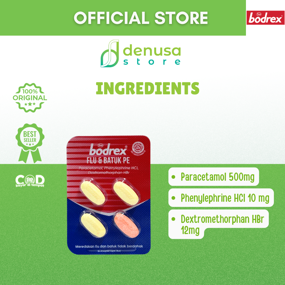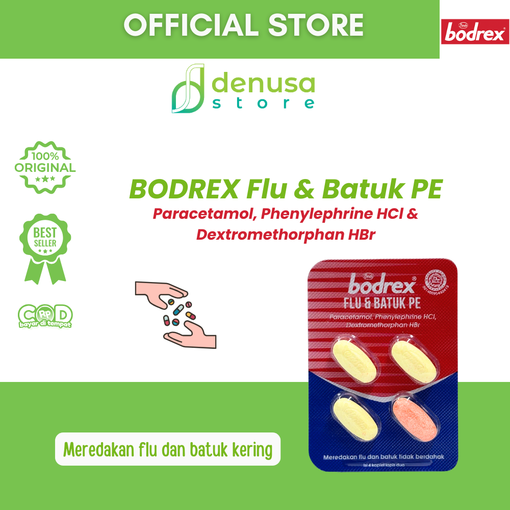 BODREX Flu n Batuk PE 1 Blister 4 Kaplet Lapis Dua merupakan obat untuk. Meredakan gejala flu dan batuk sekaligus nyeri ringan. Diformulasikan dengan kombinasi bahan aktif. Bekerja cepat untuk membantu mengurangi demam, sakit kepala, hidung tersumbat, serta batuk berdahak dan tidak berdahak.