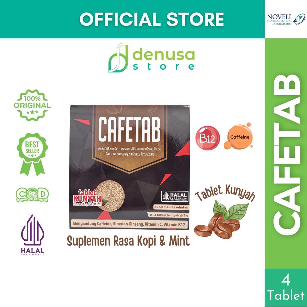 Beli CAFETAB Rasa Kopi n Mint 1 Strip 4 Tablet Kunyah hanya di denusastore.com. Solusi praktis untuk membantu menjaga stamina dan memberikan sensasi segar setiap hari.