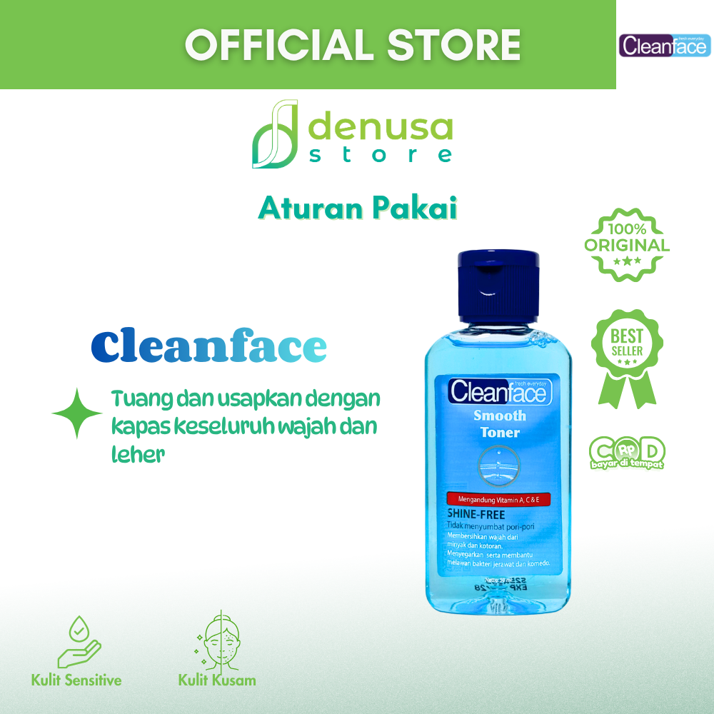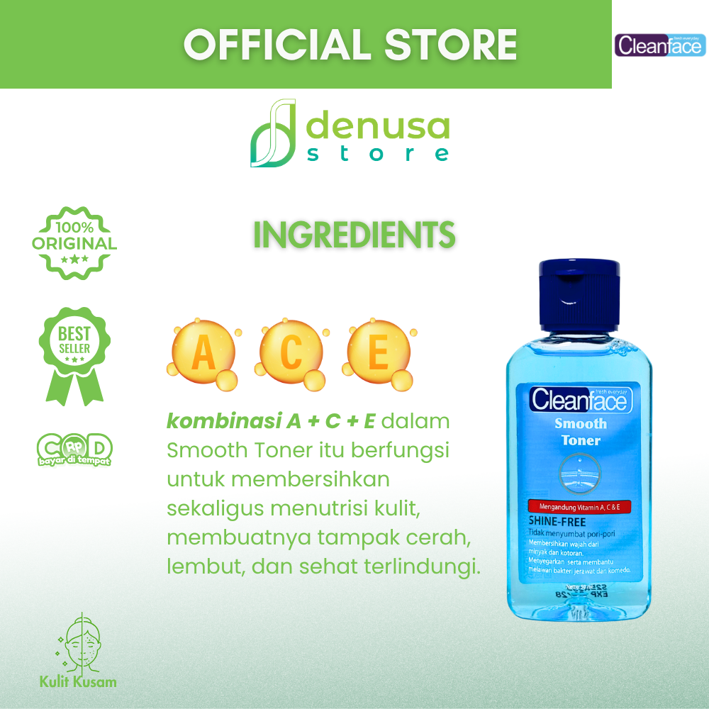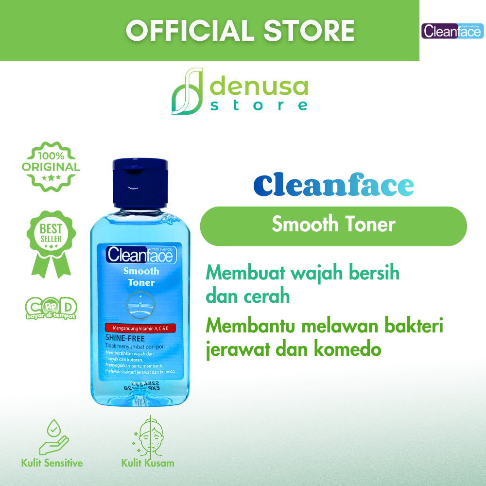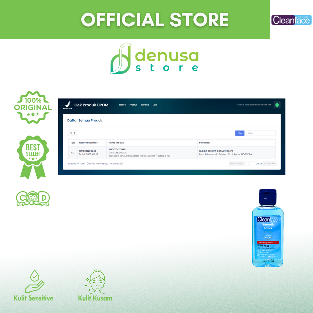 Beli CleanFace Smooth Toner Shine Free 50 ml hanya di denusastore.com dan rasakan kulit yang lebih segar, halus, dan bebas kilap sepanjang hari!