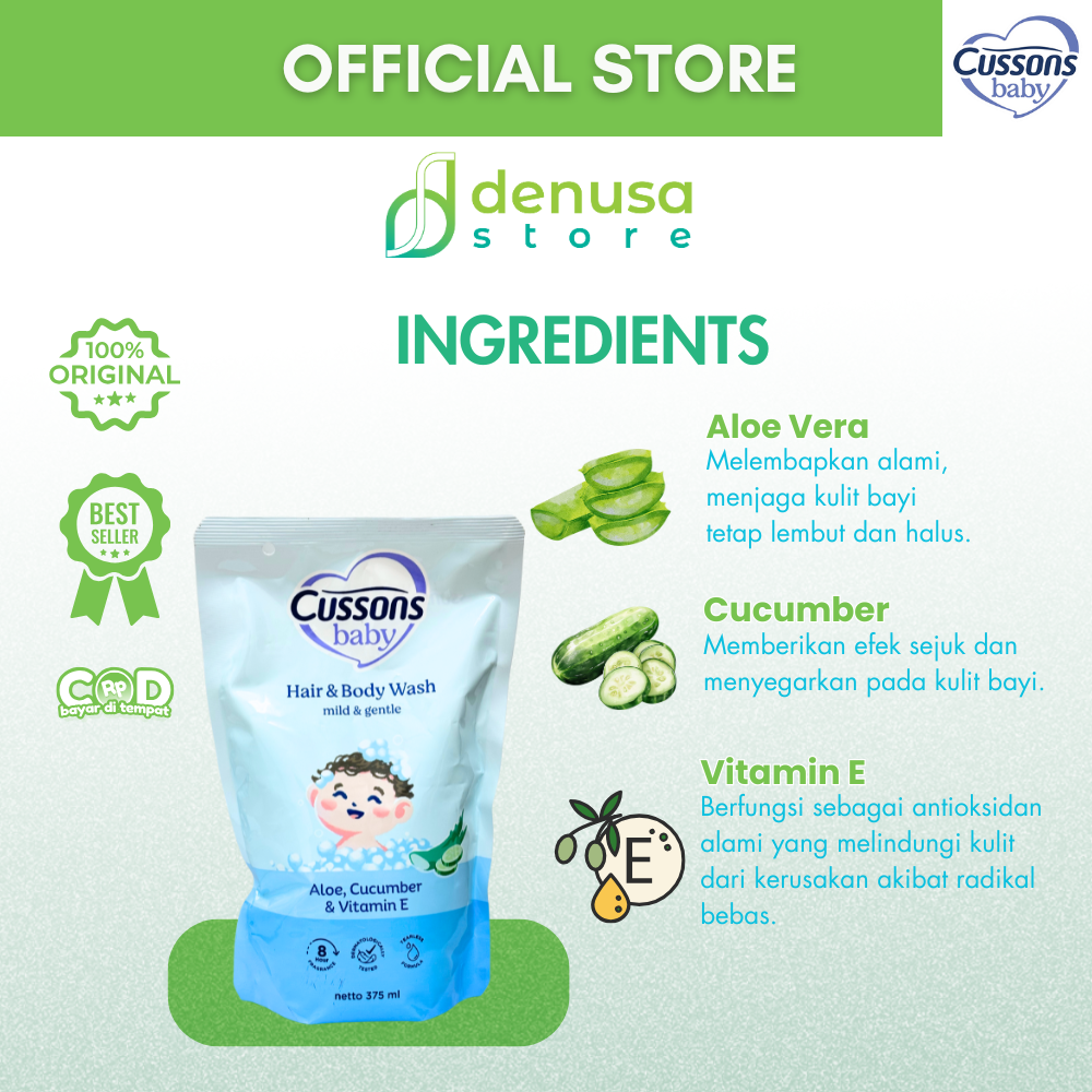 CUSSONS BABY Hair n Body Wash Mild n Gentle Refill Pouch 375 ml adalah sabun sekaligus sampo bayi dengan formula lembut. Membersihkan rambut dan tubuh bayi tanpa membuat kulit kering. Diperkaya dengan Milk dan Chamomile Extract. Membantu menutrisi, melembapkan. Serta menjaga kelembutan alami kulit bayi sejak pertama kali mandi.