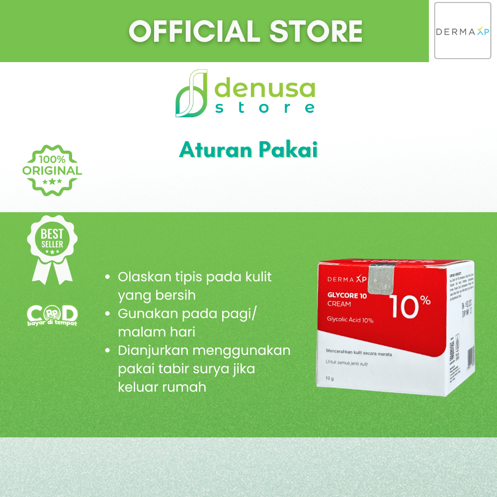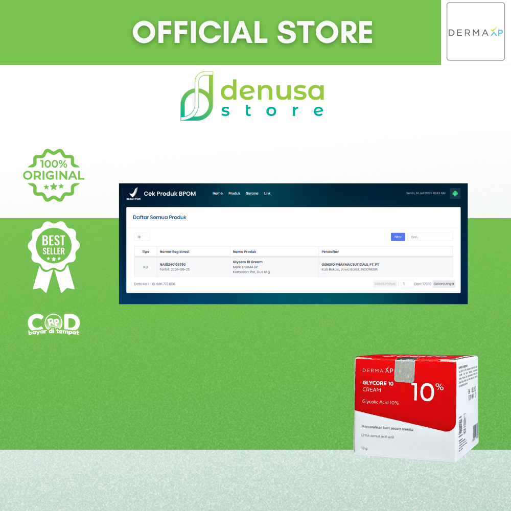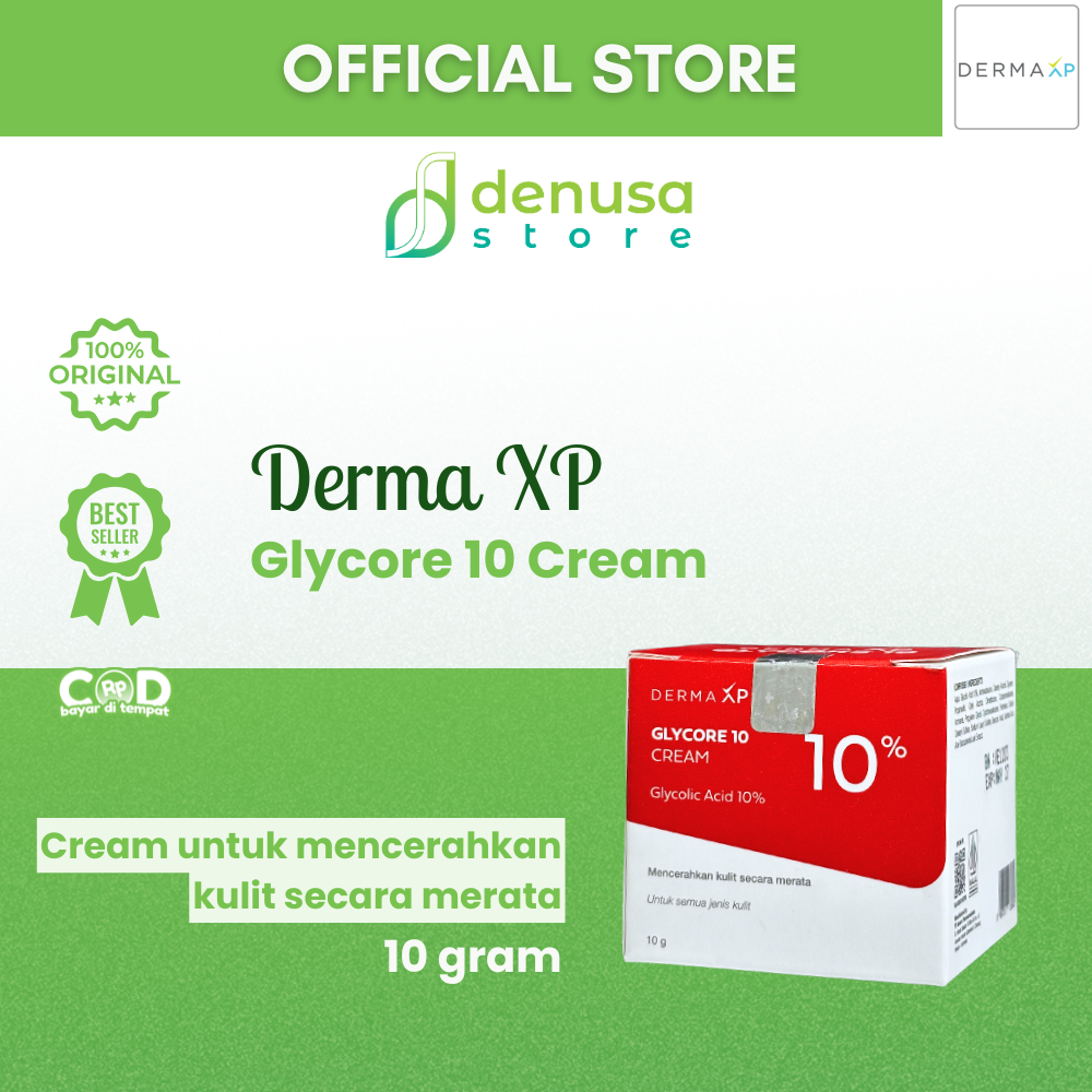 Dapatkan kulit cerah, halus, dan bebas hiperpigmentasi denga. DERMA XP Glycore 10 Cream Glycolic Acid 10% 10 g. Krim ini mengandung 10% Glycolic Acid—AHA yang ampuh mengangkat sel kulit mati, menyamarkan noda hitam, dan memperbaiki tekstur kulit & lapisan tubuh kasar seperti siku. Lutut, atau lipatan tubuh Formulanya juga diperkaya glycerin, panthenol, dan aloe vera yang menenangkan dan melembapkan kulit.