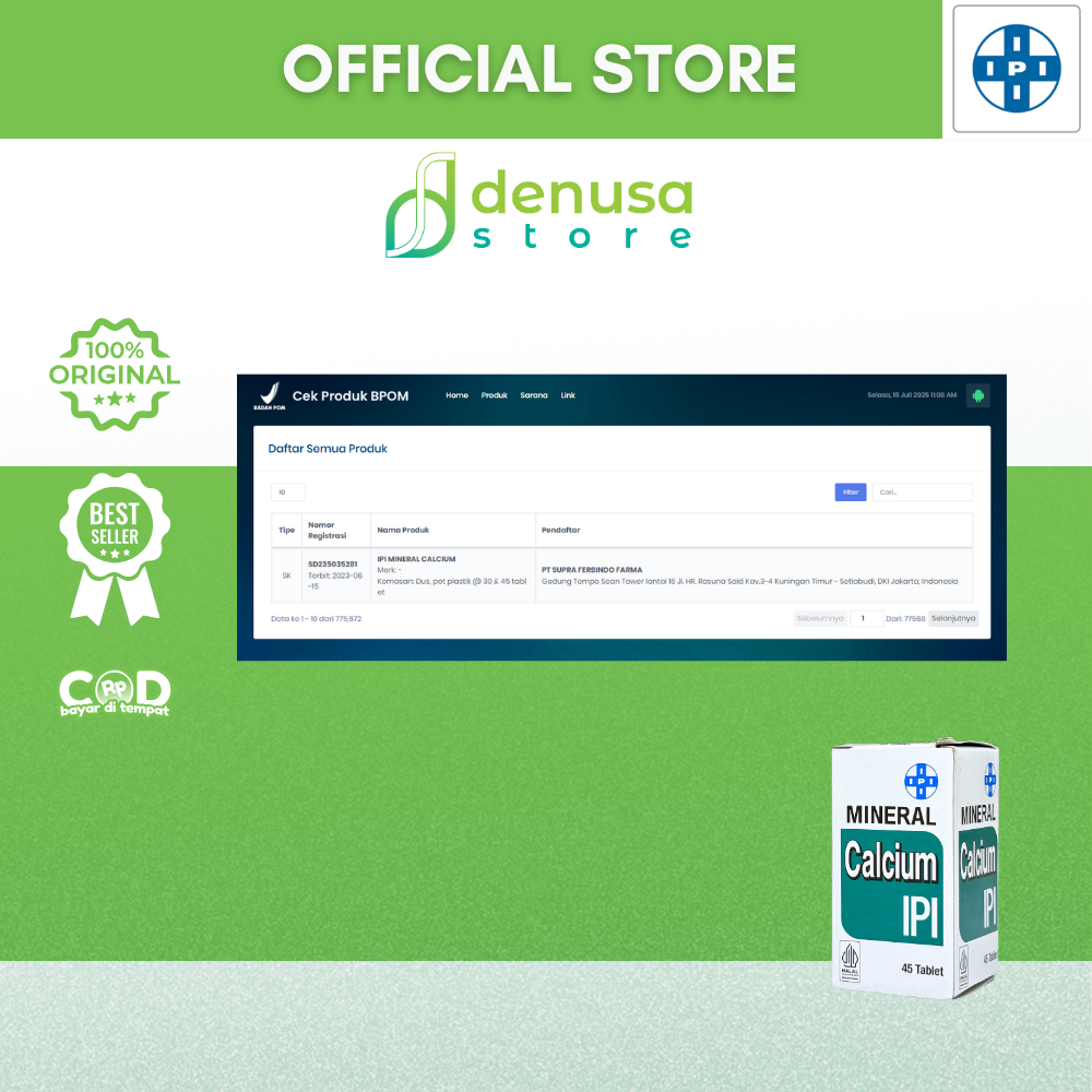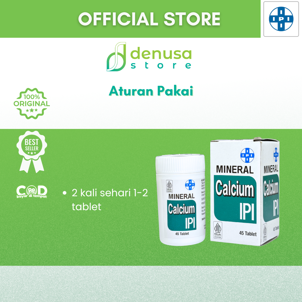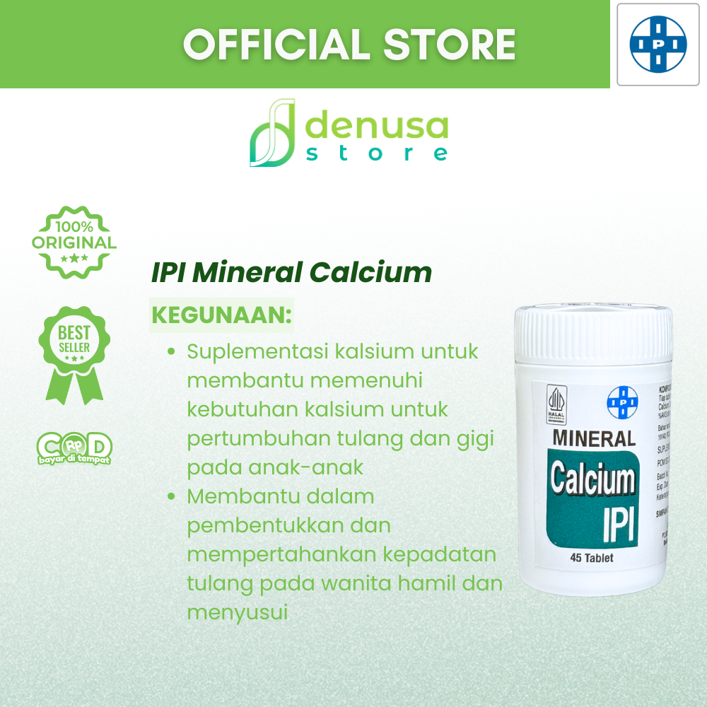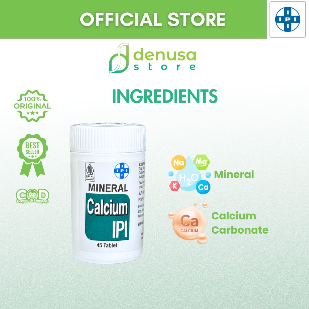 Penuhi kebutuhan kalsium harian dengan. IPI Mineral Calcium 45 Tablet. Suplemen ini mengandung 250 mg kalsium dari Calcium Carbonate, bermanfaat untuk membantu pembentukan dan pemeliharaan kesehatan tulang serta gigi. Terutama pada masa pertumbuhan, ibu hamil, menyusui, dan lansia.