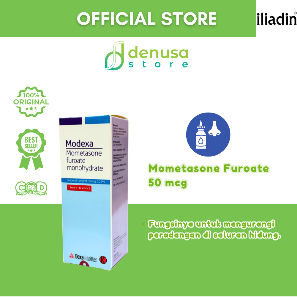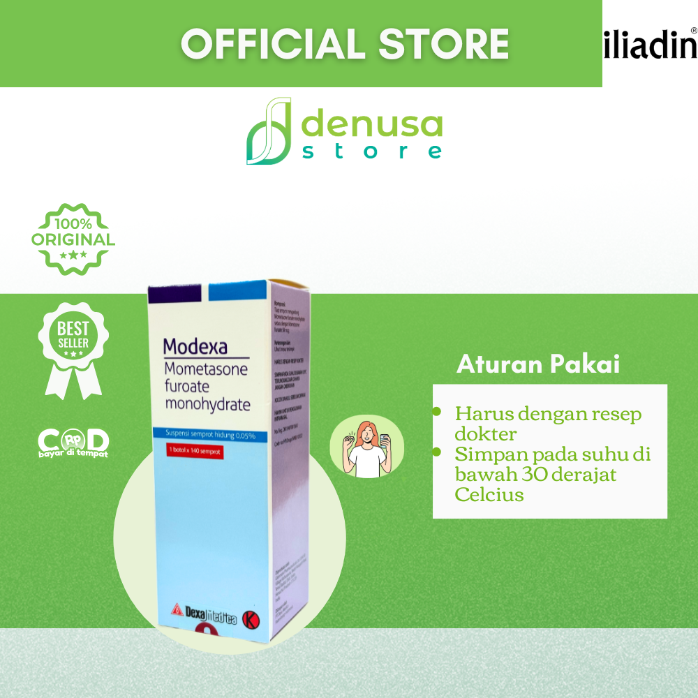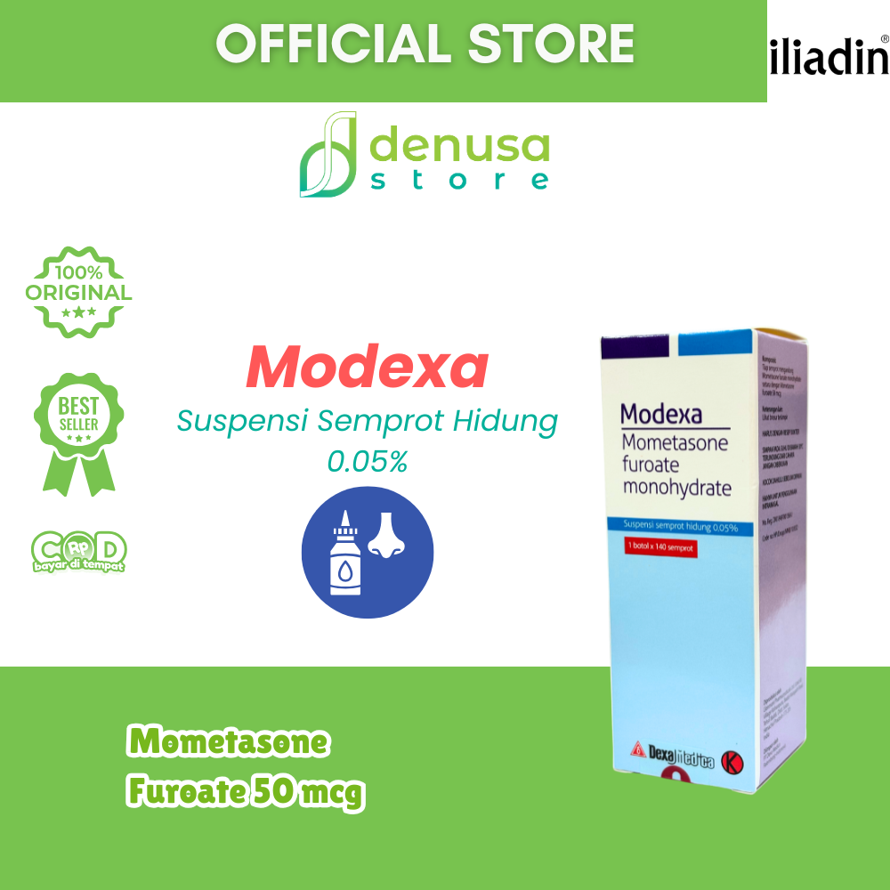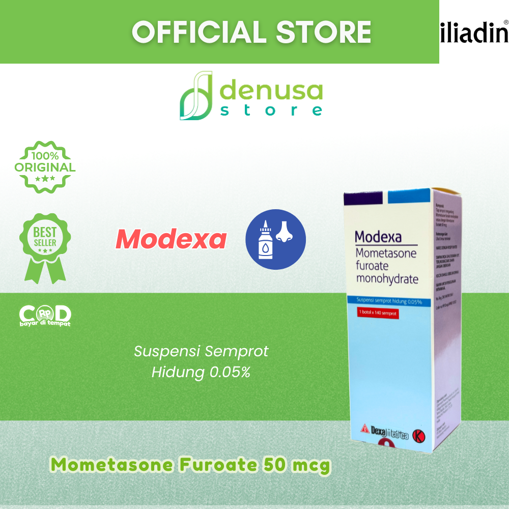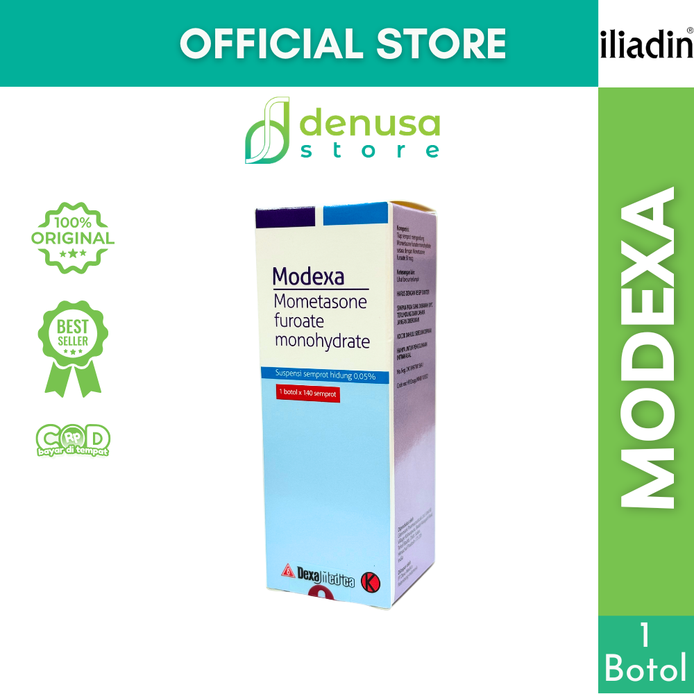 MODEXA Nasal Spray Suspension 0.05% 1 Bottle 140 Sprays adalah semprotan hidung. Digunakan untuk membantu meredakan gejala alergi pada hidung sesuai petunjuk tenaga kesehatan. Mengandung mometasone furoate 0.05% dalam bentuk suspensi nasal. Praktis digunakan setiap hari. Membantu menjaga kenyamanan saluran pernapasan.