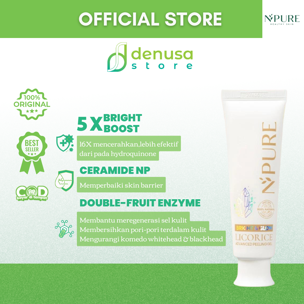 Beli NPURE Licorice Bright n Glow Advanced Peeling Gel PlusSome 50ml hanya di denusastore.com dan bantu cerahkan kulitmu dengan eksfoliasi lembut yang mendalam.