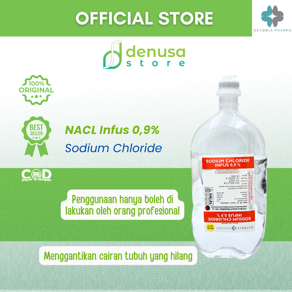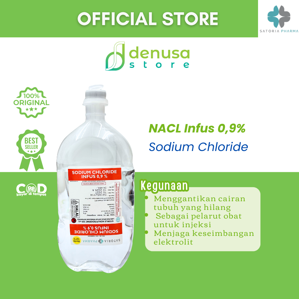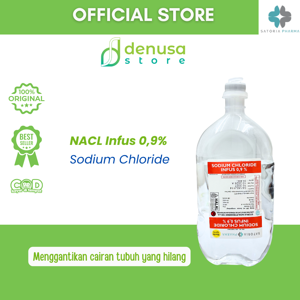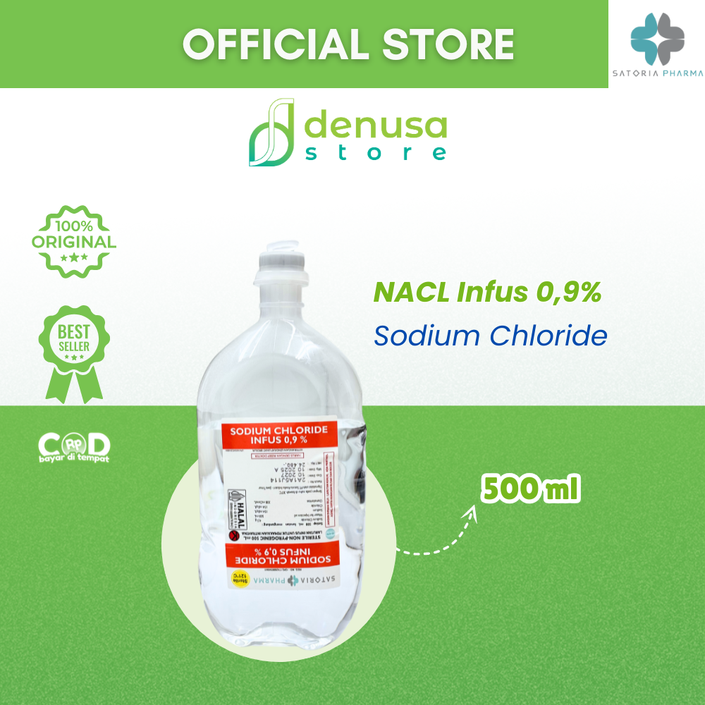 SATORIA PHARMA Sodium Chloride NACL Infus 0,9% 500 ml adalah larutan infus steril yang diformulasikan untuk membantu menjaga keseimbangan cairan dan elektrolit tubuh. Larutan garam fisiologis ini aman digunakan untuk hidrasi, pencairan obat, atau perawatan medis lainnya sesuai anjuran tenaga medis profesional.