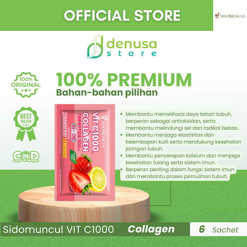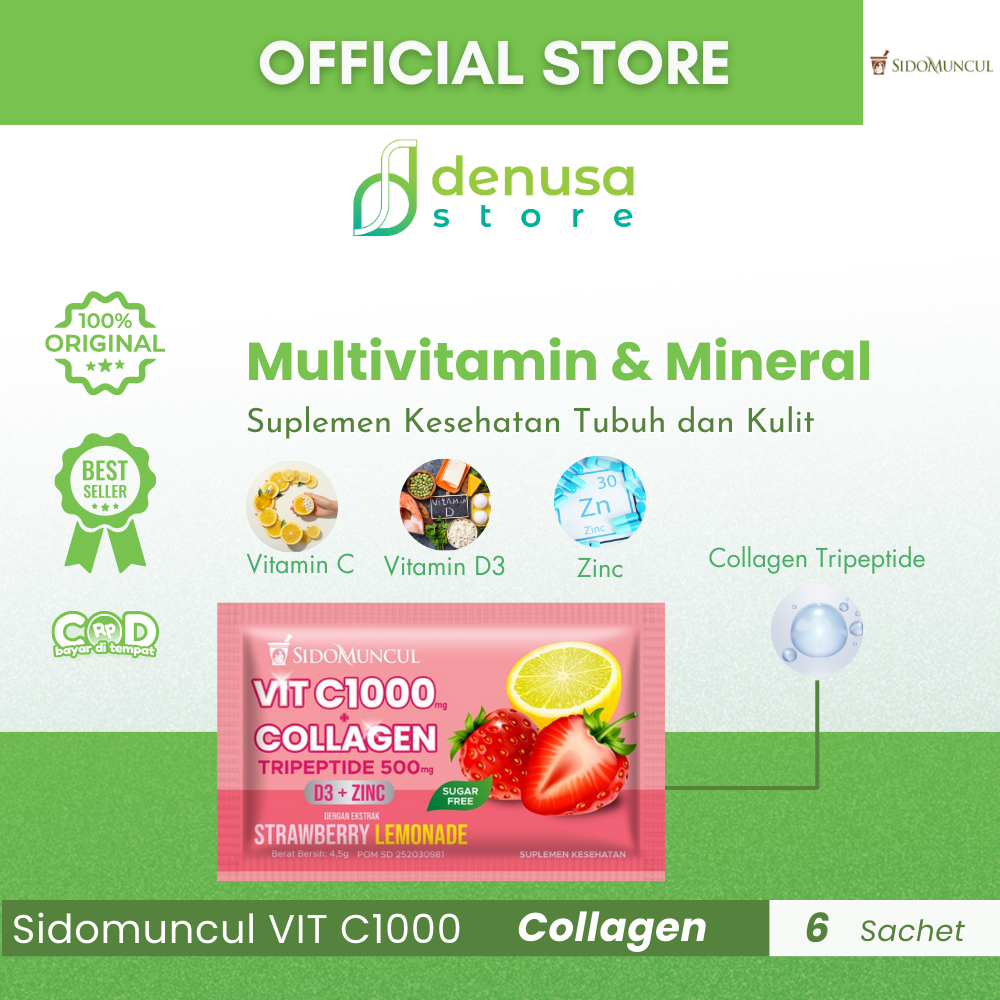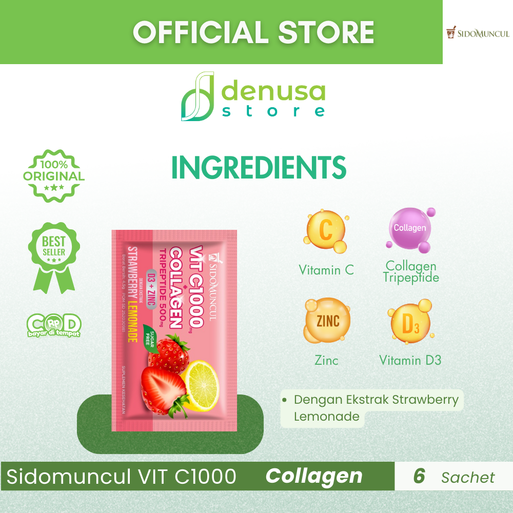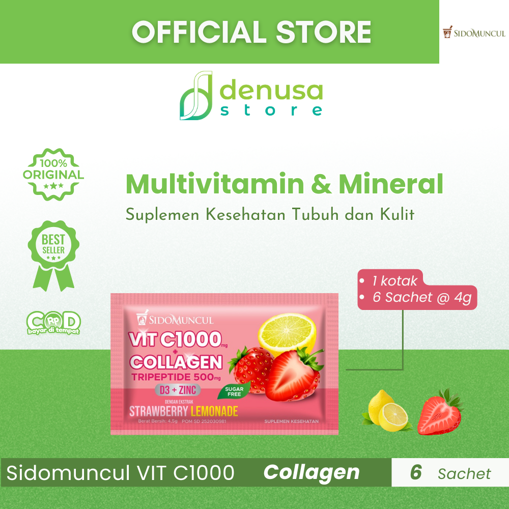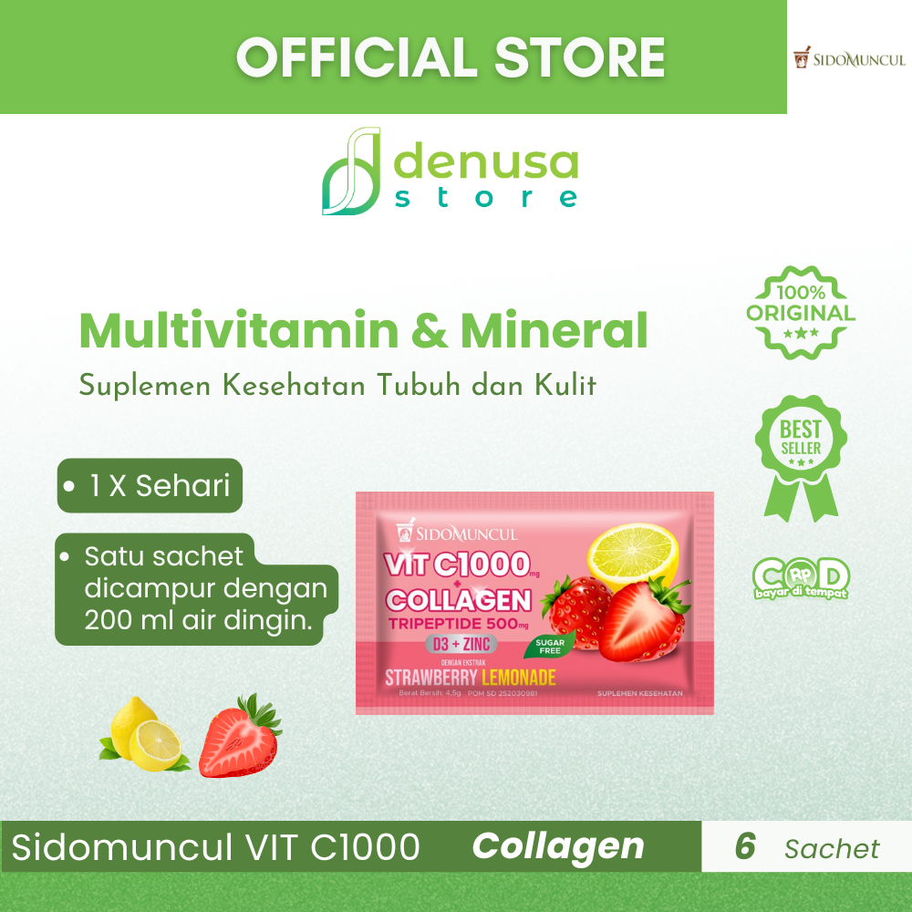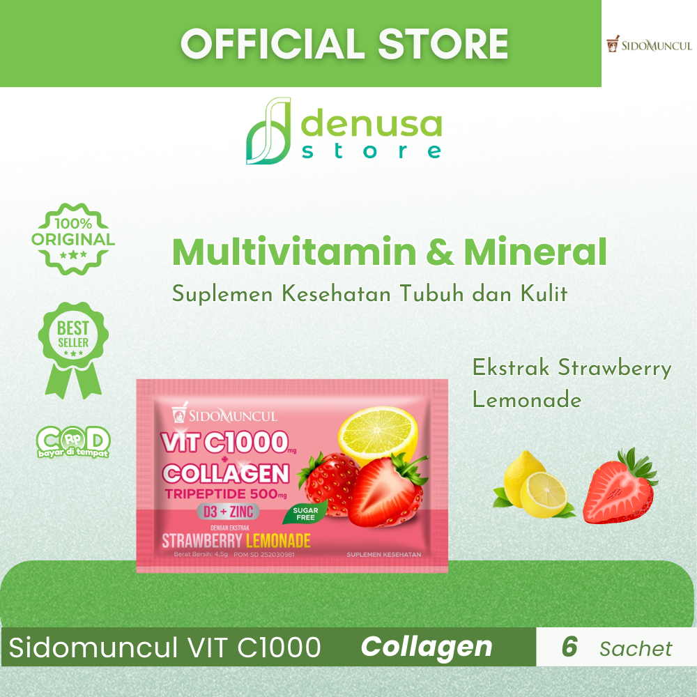 Beli Sidomuncul VIT C1000 COLLAGEN D3 Zinc Strawberry Lemonade 1 Kotak 6 Sachet hanya di denusastore.com. Dapatkan dukungan kesehatan dan kecantikan dalam satu kemasan praktis!