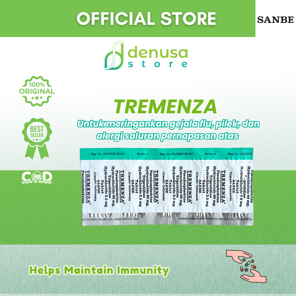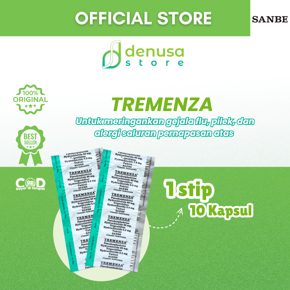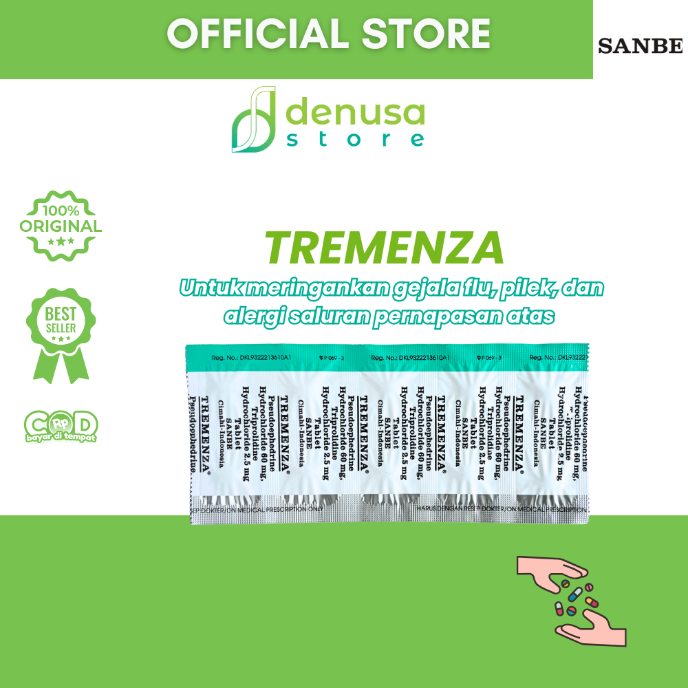 TREMENZA Tablet 1 Strip 10 Tablet adalah kombinasi Pseudoephedrine dan Triprolidine. Berfungsi sebagai dekongestan dan antihistamin. Pseudoephedrine membantu mengurangi pembengkakan pada mukosa saluran pernapasan melalui efek vasokonstriksi sehingga hidung terasa lebih lega. Sedangkan Triprolidine bekerja menghambat efek histamin untuk meredakan gejala alergi seperti bersin dan hidung meler.