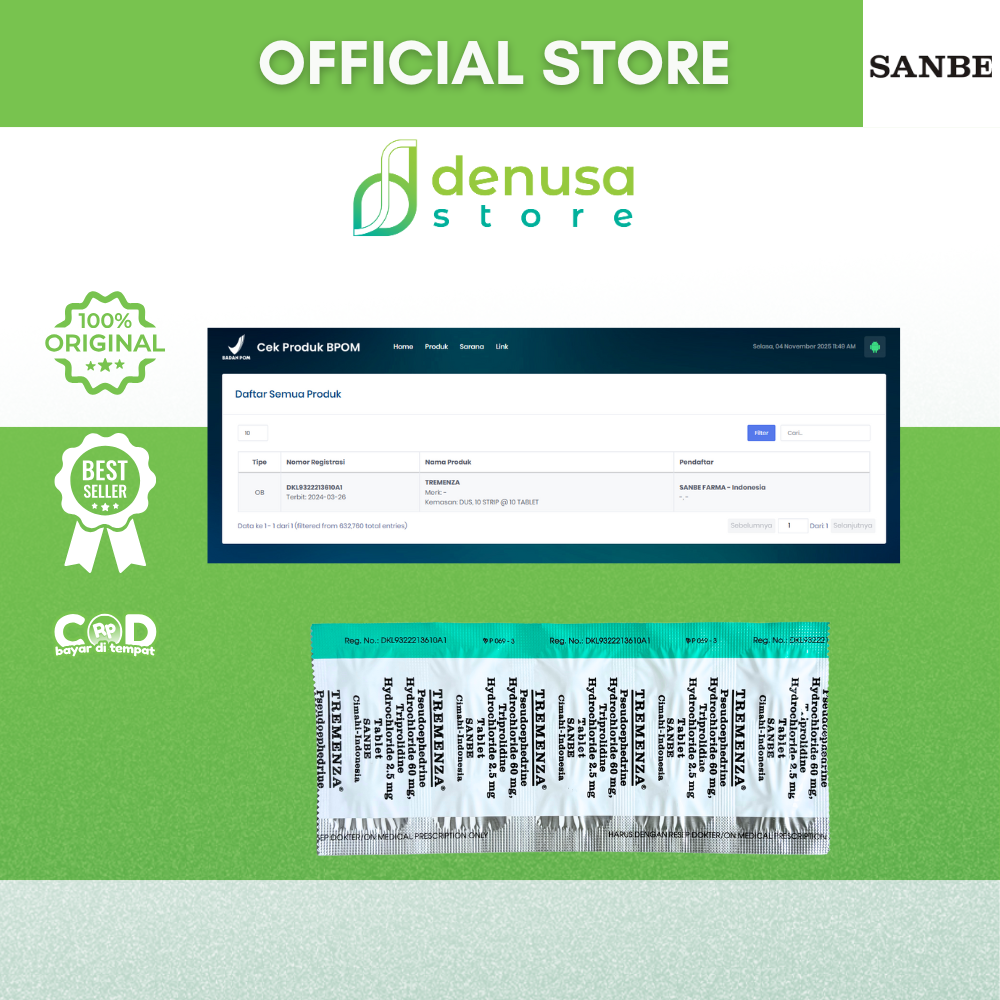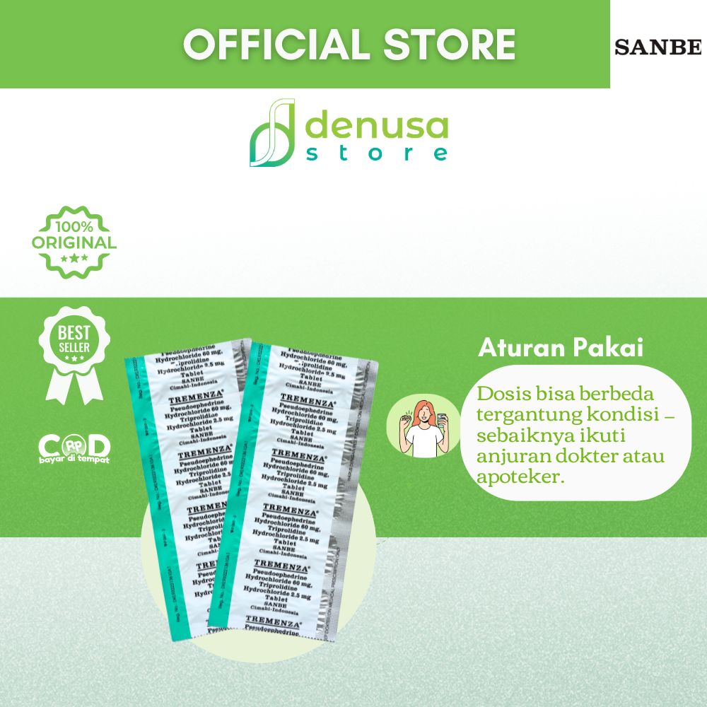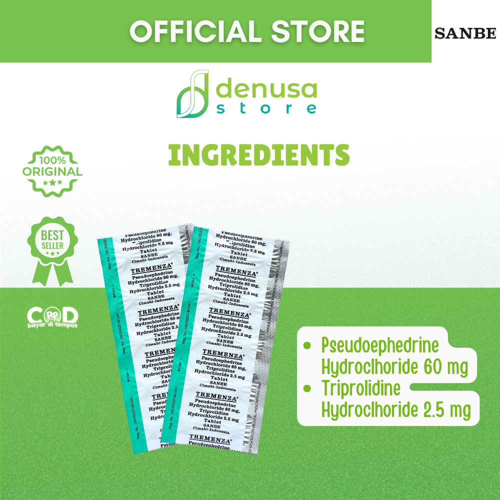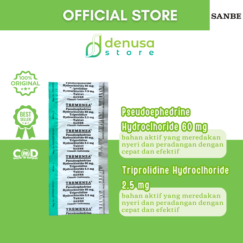TREMENZA Tablet 1 Strip 10 Tablet adalah kombinasi Pseudoephedrine dan Triprolidine. Berfungsi sebagai dekongestan dan antihistamin. Pseudoephedrine membantu mengurangi pembengkakan pada mukosa saluran pernapasan melalui efek vasokonstriksi sehingga hidung terasa lebih lega. Sedangkan Triprolidine bekerja menghambat efek histamin untuk meredakan gejala alergi seperti bersin dan hidung meler.